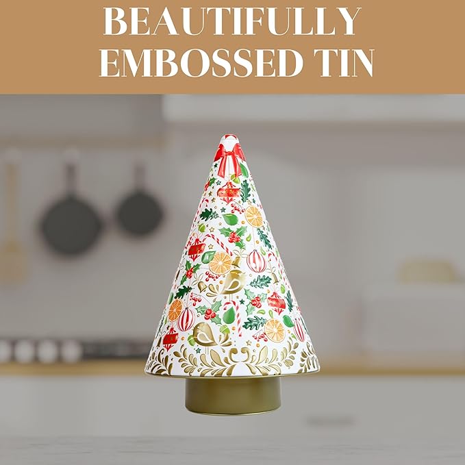 Lata musical em forma de uma árvore de natal com tampa em baixo. A base da lata, quando é rodada, toca música. Prenda ideal para oferecer recheada com doces/chocolates.