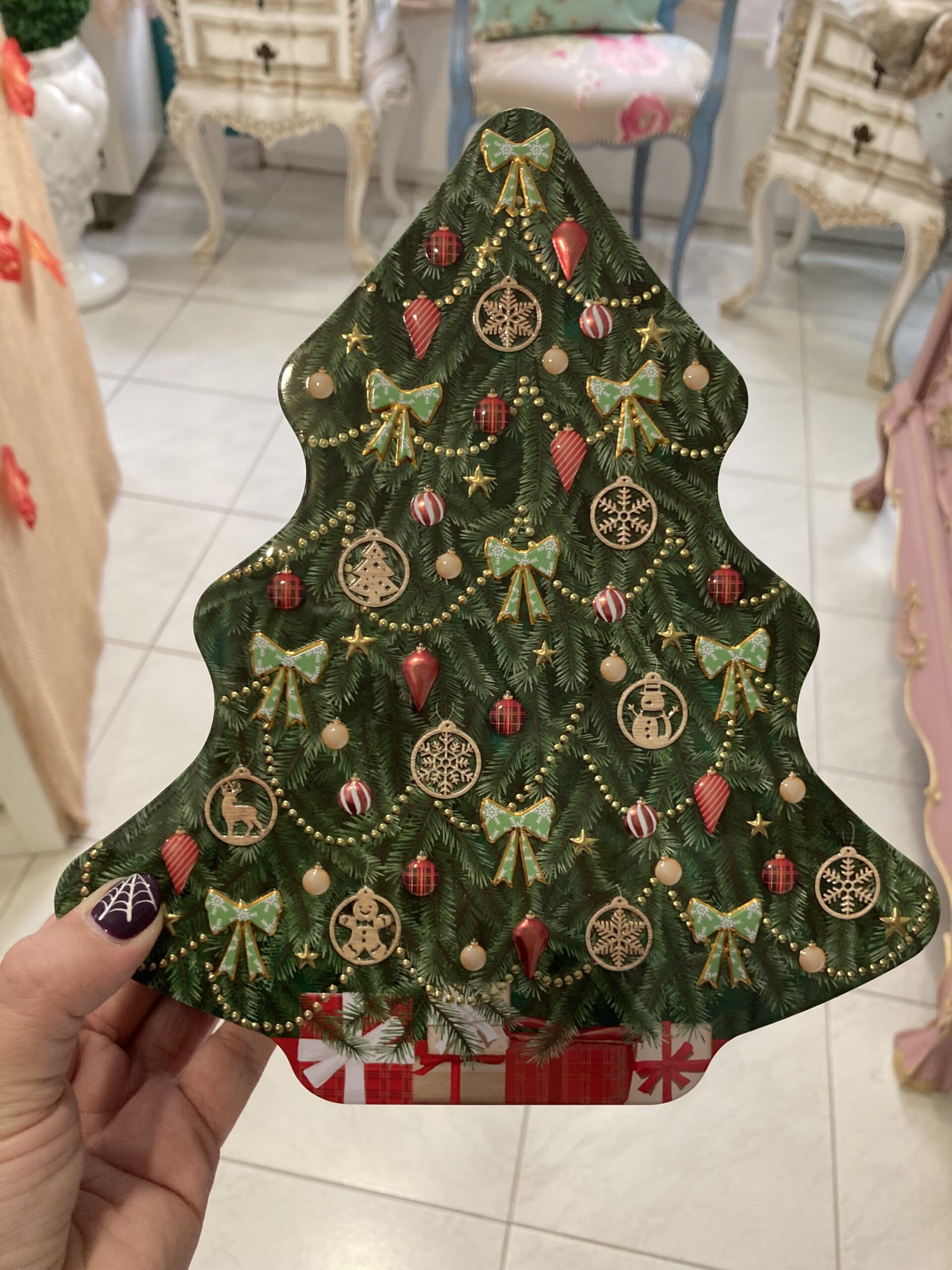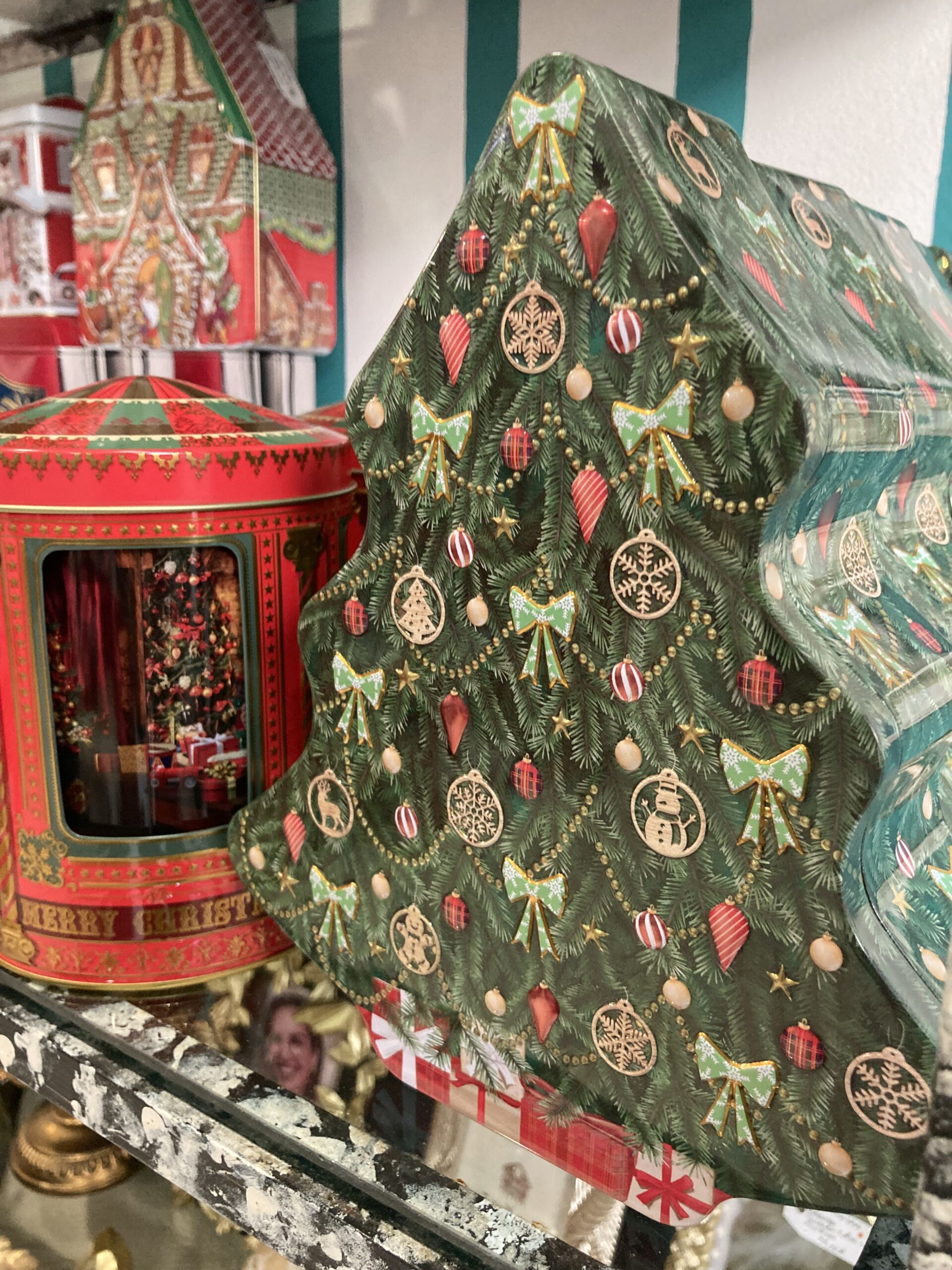 Lata em forma de uma árvore de natal com tampa. Prenda ideal para oferecer recheada com doces/chocolates.